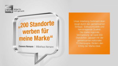 Mit Interliving präsentiert der Einrichtungspartnerring VME seine erste nationale Waren- und Händlermarke. Das Ziel ist, als starke Marke zur Erhöhung der Frequenz bei den Händlern zu dienen. Ergebnis ist der strategische Aufbau einer neuen Marke von Grund auf, einhergehend mit einer einheitlichen Markenkommunikation und klaren Guidelines für alle Werbemittel.